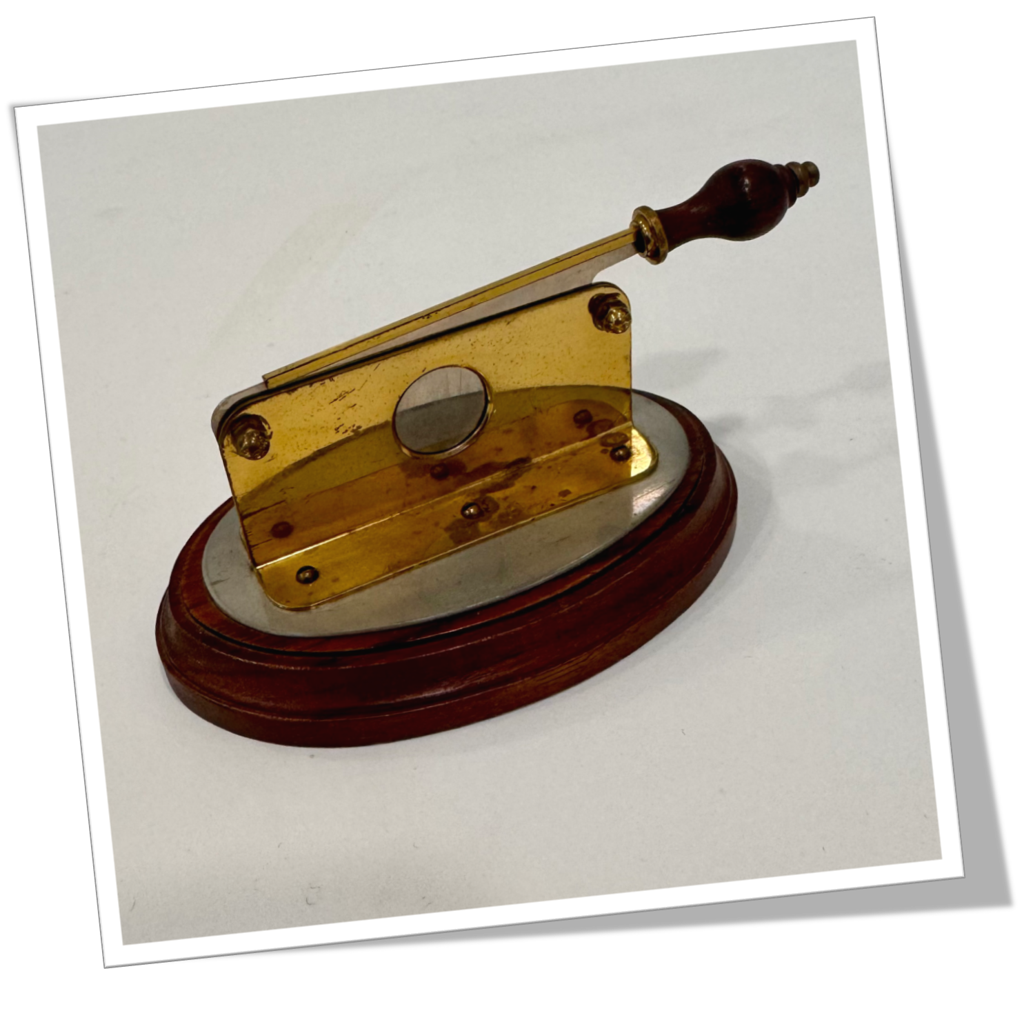En laiton et en forme de trancheuse de pain. Embout de poignée et base en bois.