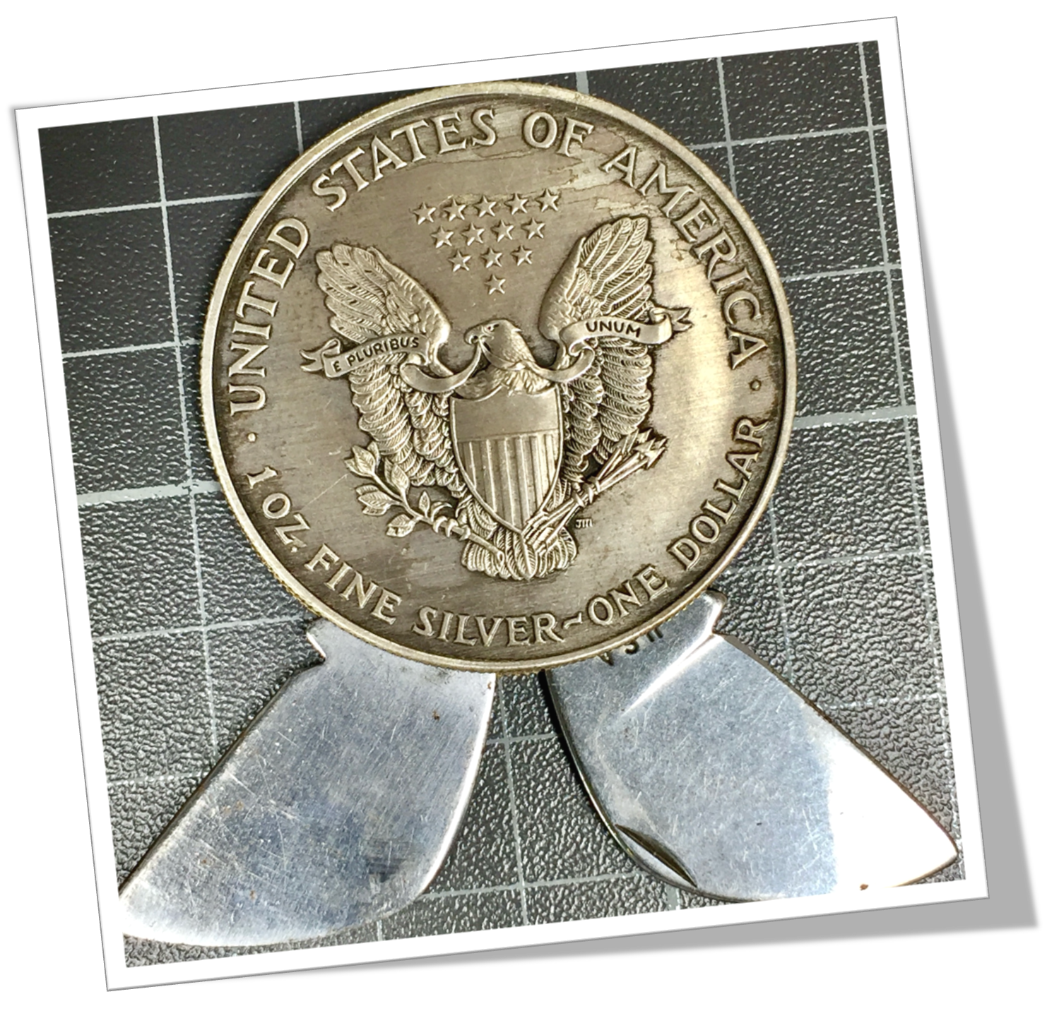 Coin-Knife (onglier) Pièce en argent 900, tranchée et rivetée. Walking Liberty dollar, USA 1997.2pcs: Lame et lime.