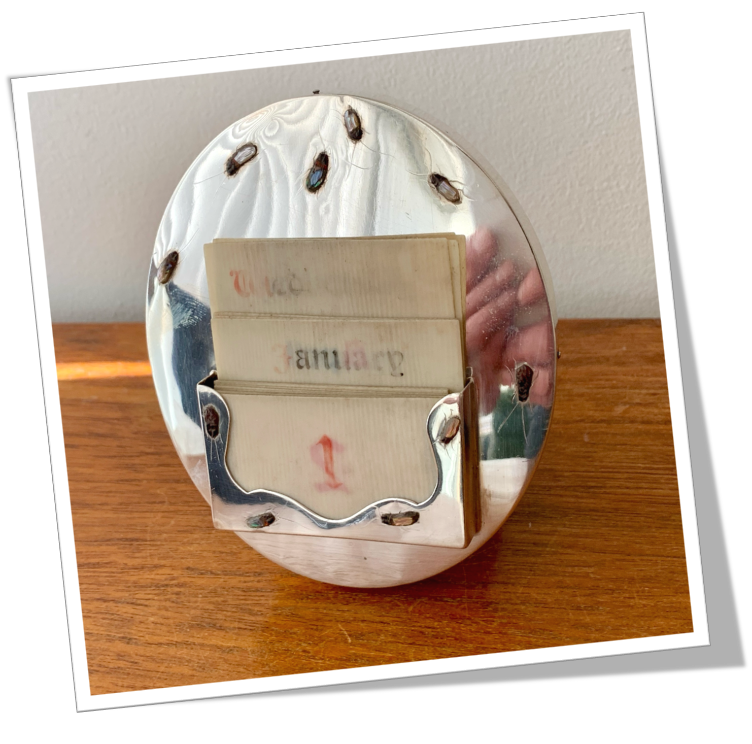 Calendrier perpétuel En argent 925 et de forme ovoïde. Lisse poli miroir avec insectes de style Shibayama appliqués tout autour.Cartes des jours, dates et mois de l’année. Guichet.