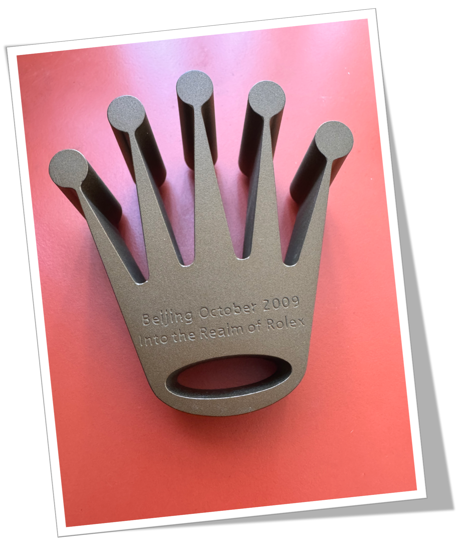 Presse-Papier En Acier De Couleur Bronze Formant La Couronne Rolex. Réhaussé au verso de l’inscription : « Beijing October 2009 – Into the Reaimof Rolex ».-