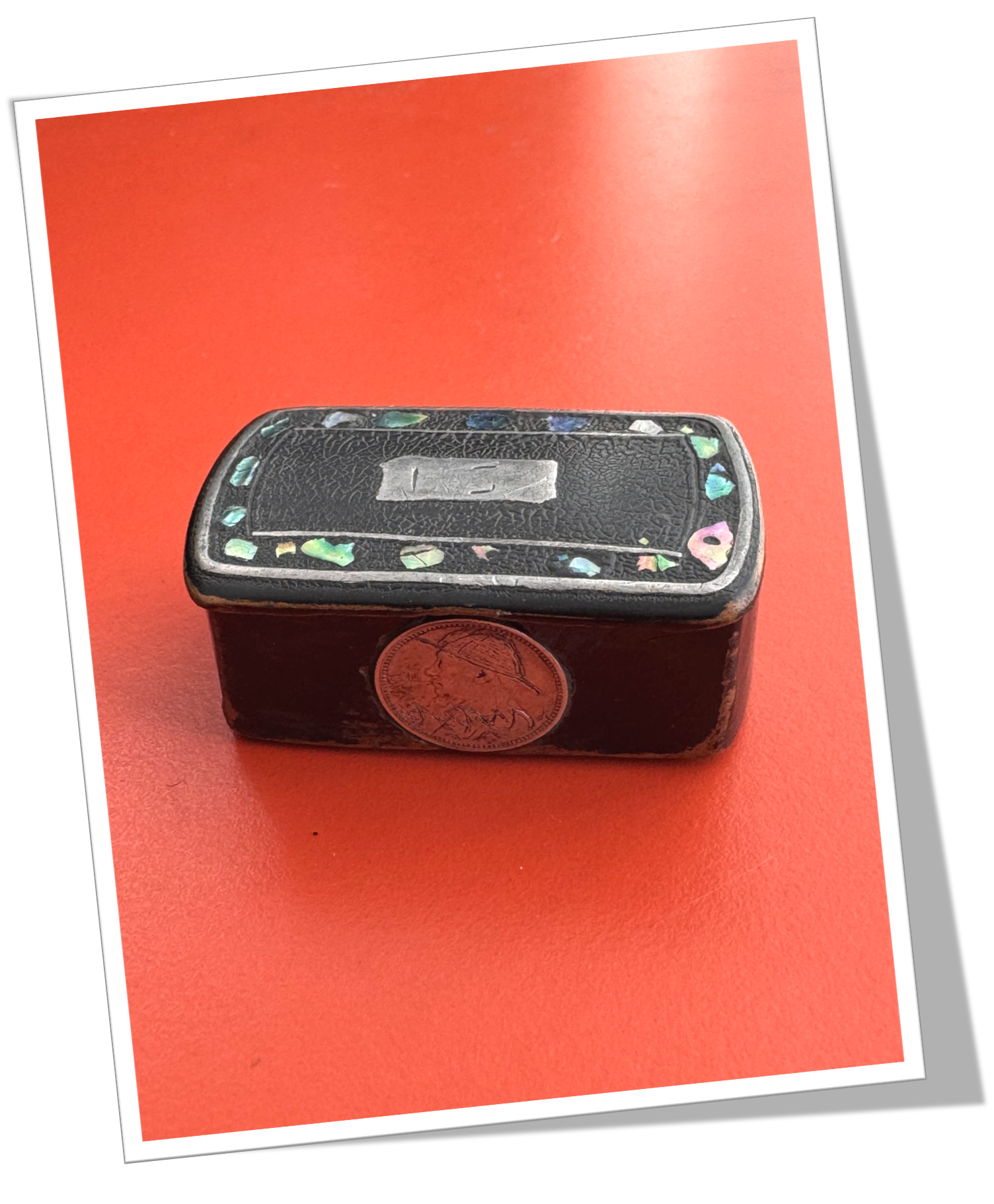 Tabatière de poche En papier maché durci et peint, réhaussé sur son capot d’inserts nacrés et d’un catouche au monogramme « L S ». Agrémentée sur sa face avant d’une pièce ZAR, Paul Kruger, customisée.Capot 1/5 4/5.