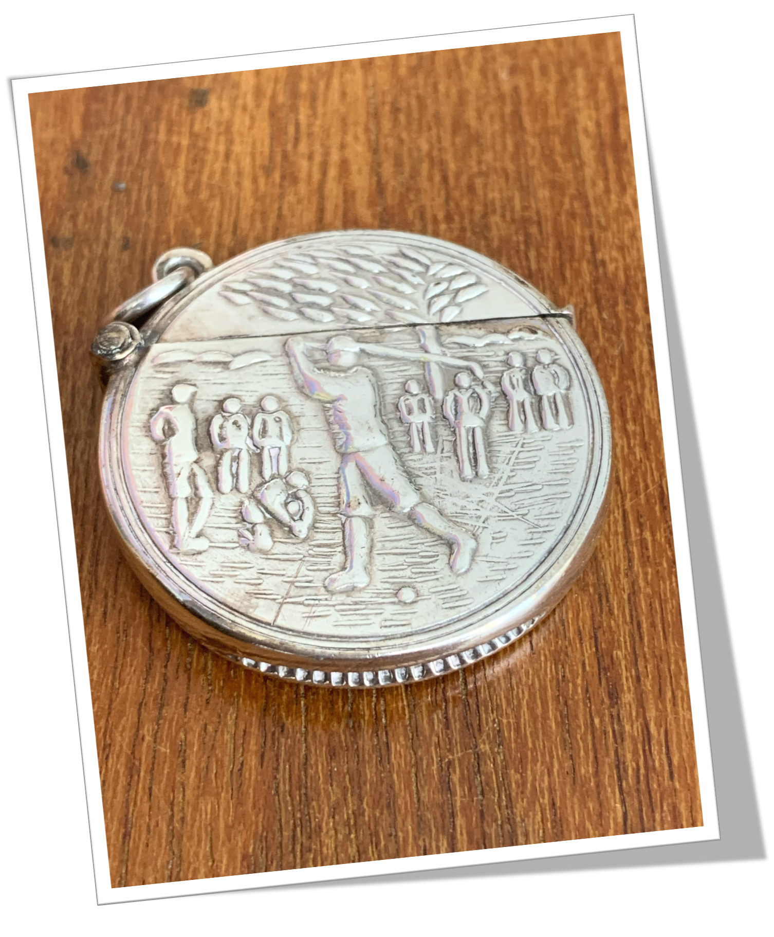Pyrogène Vesta Case En argent 925 et de forme circulaire. Rehaussé d’une scène de golf en technique « repoussé », représentant un golfeur en action en premier plan, sur fond de spectateurs, en arrière plan.Clapet 1/5 4/5 et grattoir concave à la base. Bélière haute latérale.