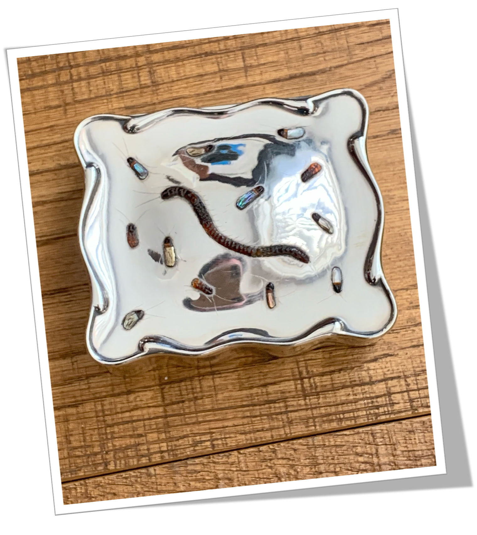 En argent 925 et de forme polygonale. Lisse poli miroir avec insectes et mille-pattes de style Shibayama appliqués sur le capot. Coque intérieur en velours vert.