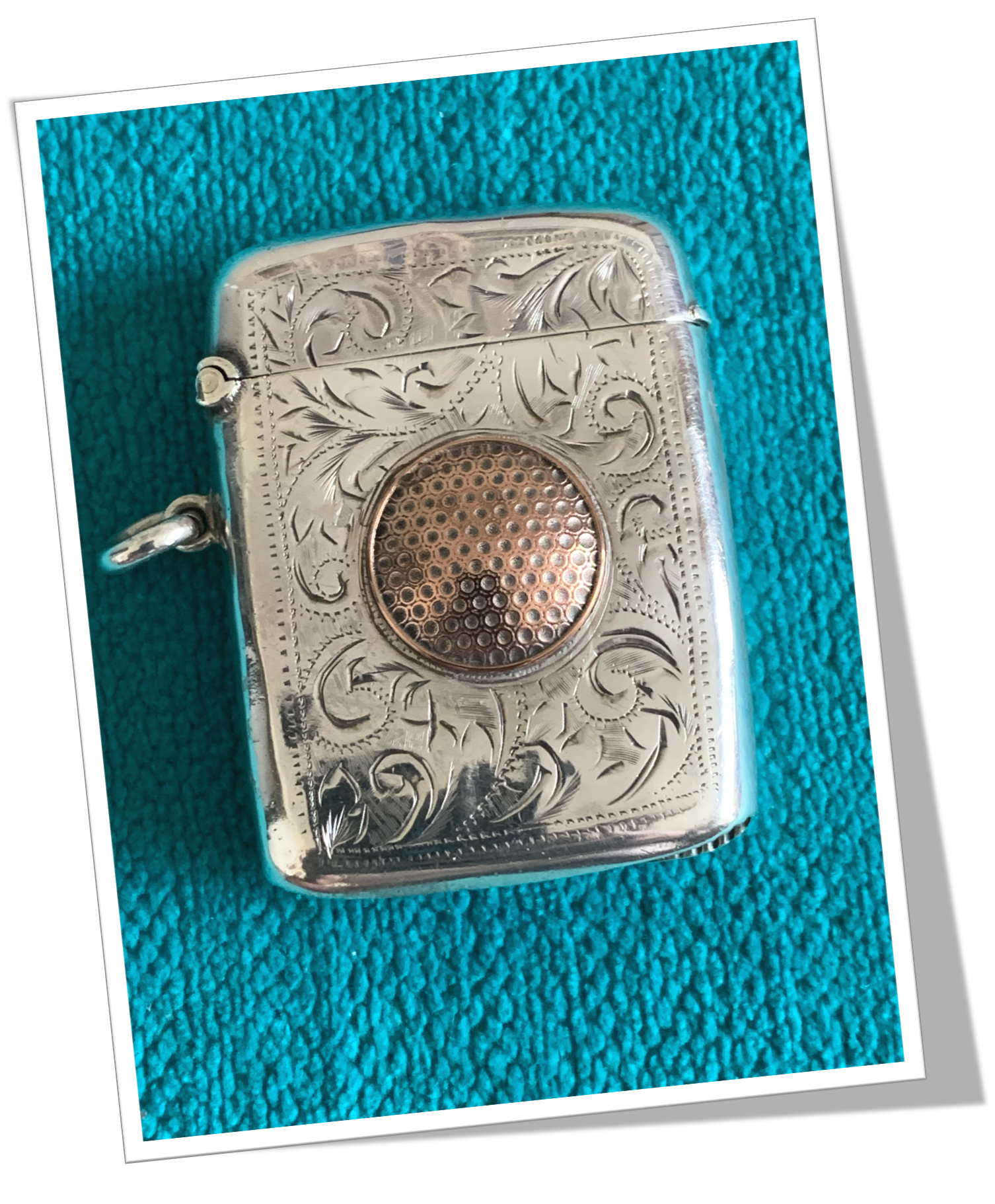Pyrogène Vesta Case En argent 925 et de forme rectangulaire. Rehaussé d’un guillochis de rinceaux ciselés et, agrémenté au recto d’un médaillon circulaire plaqué or appliqué, représentant une balle de golf. 31,10gr brutes.Clapet 1/5 4/5 et grattoir concave à la base. Anneau soudé agrémenté d’une bélière latérale.