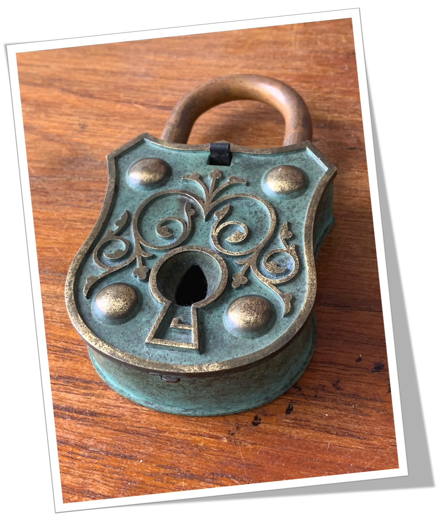 En laiton à patine verte et dorure, et de style Novelty tardif. Cadenas antique.