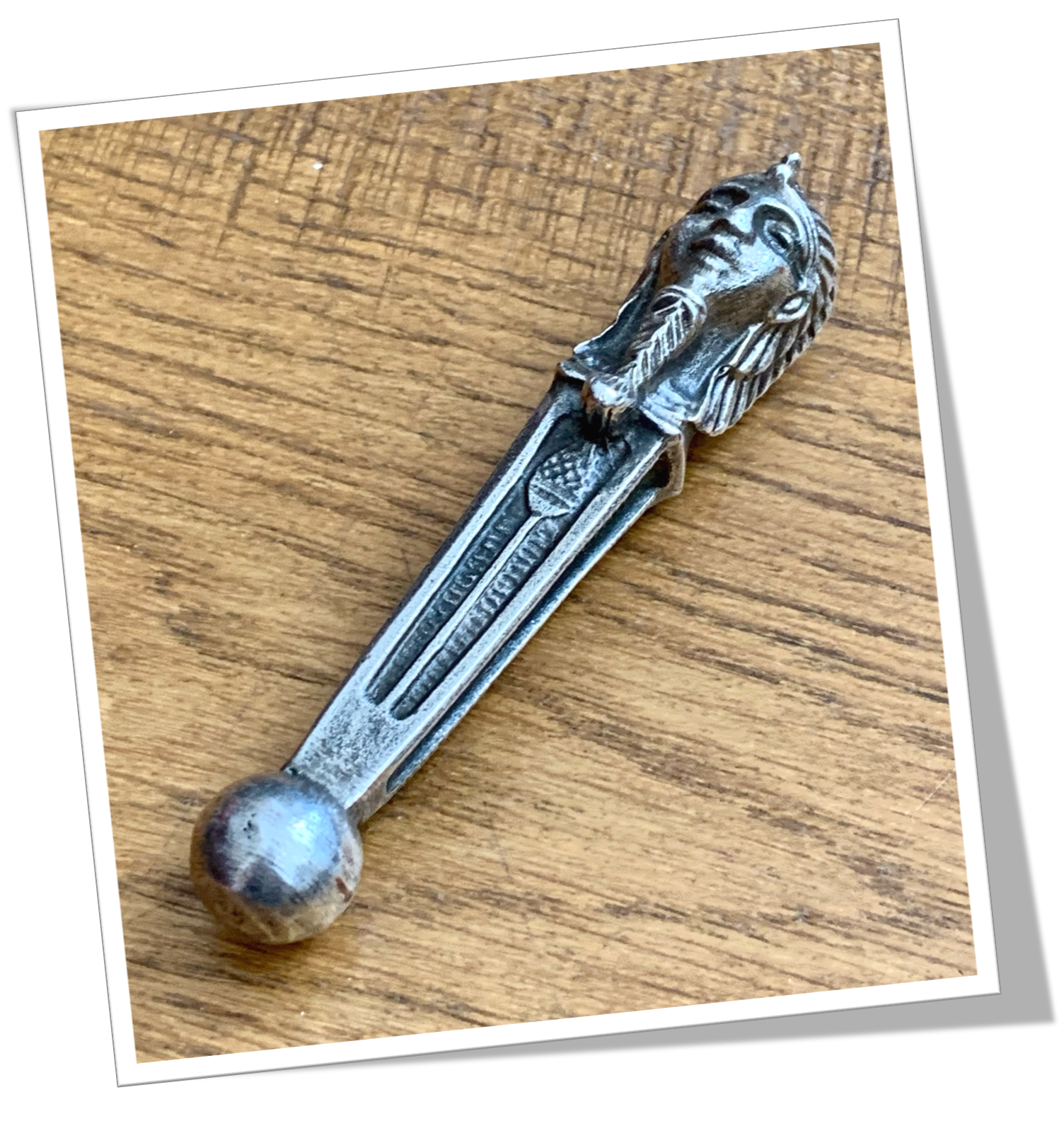 De style Novelty tardif, un totem avec tête de pharaon en laiton argenté.