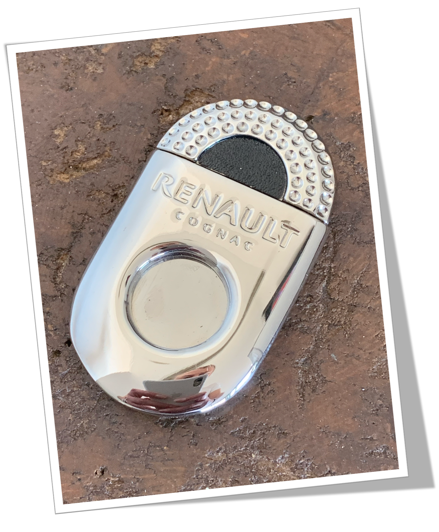 Coupe-Cigare de poche Côtes ovoïdes en acier chromé lisse poli miroir, rehaussé au recto de pois. Guillotine à collerette.