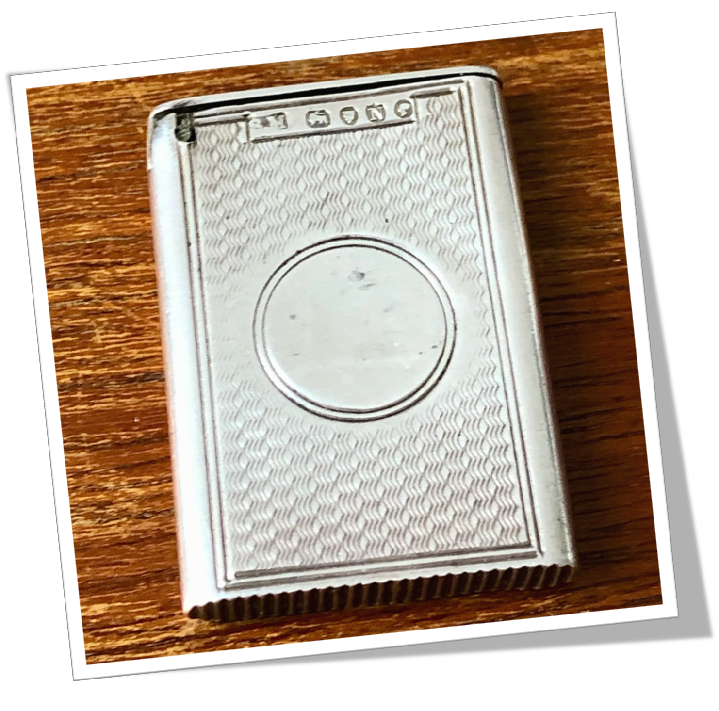 En argent 925 et de forme rectangulaire à bords arrondis. Rehaussé d’un guillochis « cinétique antique » et, agrémenté au recto d’un cartouche circulaire vierge.