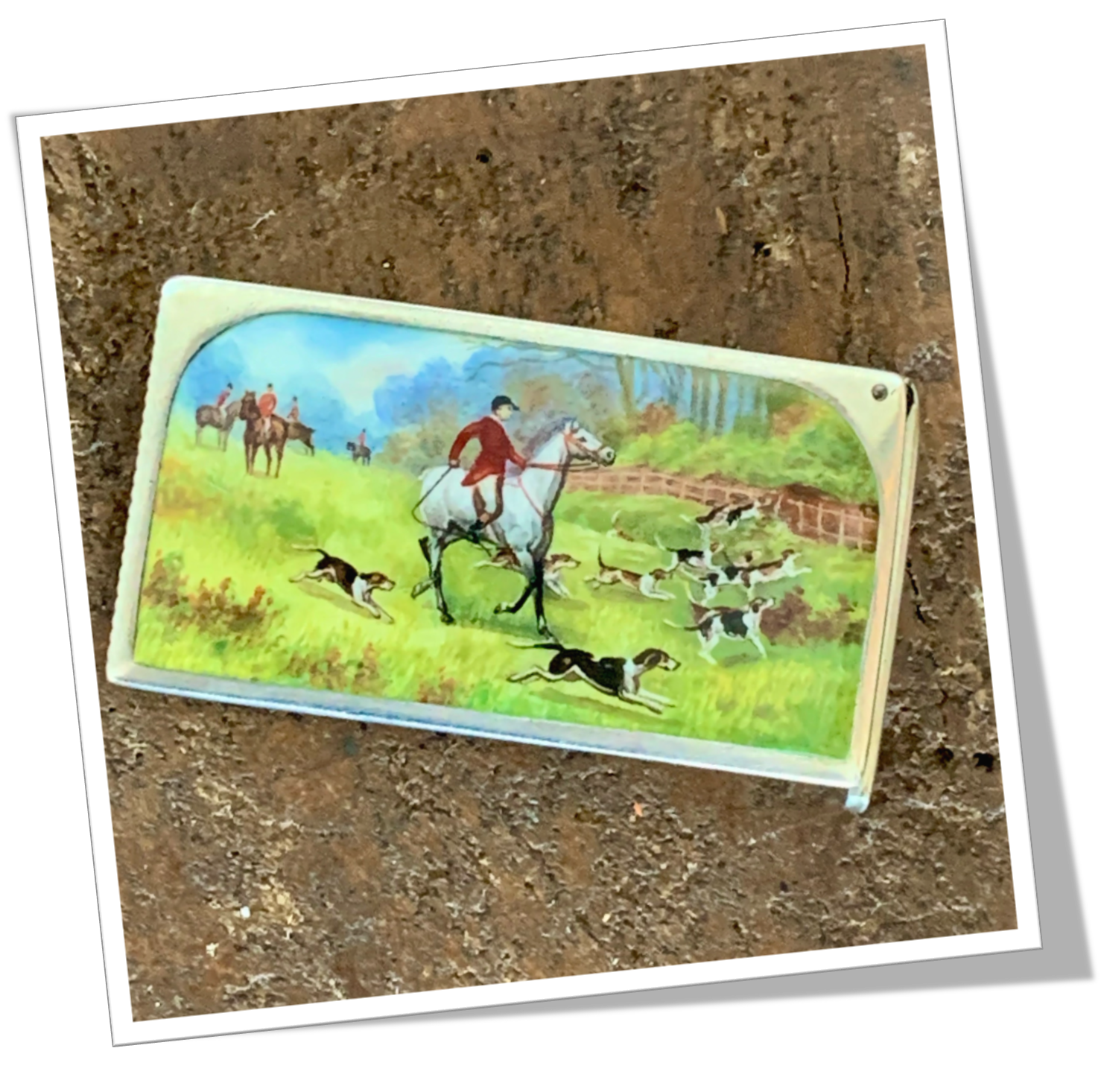 Pyrogène Vesta Case En argent 925 et de forme rectangulaire à angles droits. Lisse poli miroir et agrémenté au recto d’une œuvre émaillée peinte à la main et de style Victorien, représentant une scène de chasse à courre mettant en avant un chasseur à cheval en tenue d’époque, suivant sa meute de chien. En arrière plan sur fond de forêt, quatre autres chasseurs à cheval sont au repos. Monogramme « Stolen from Alfred E. Stuid » au verso. 37g.Clapet à zéro et grattoir plat à la base.
