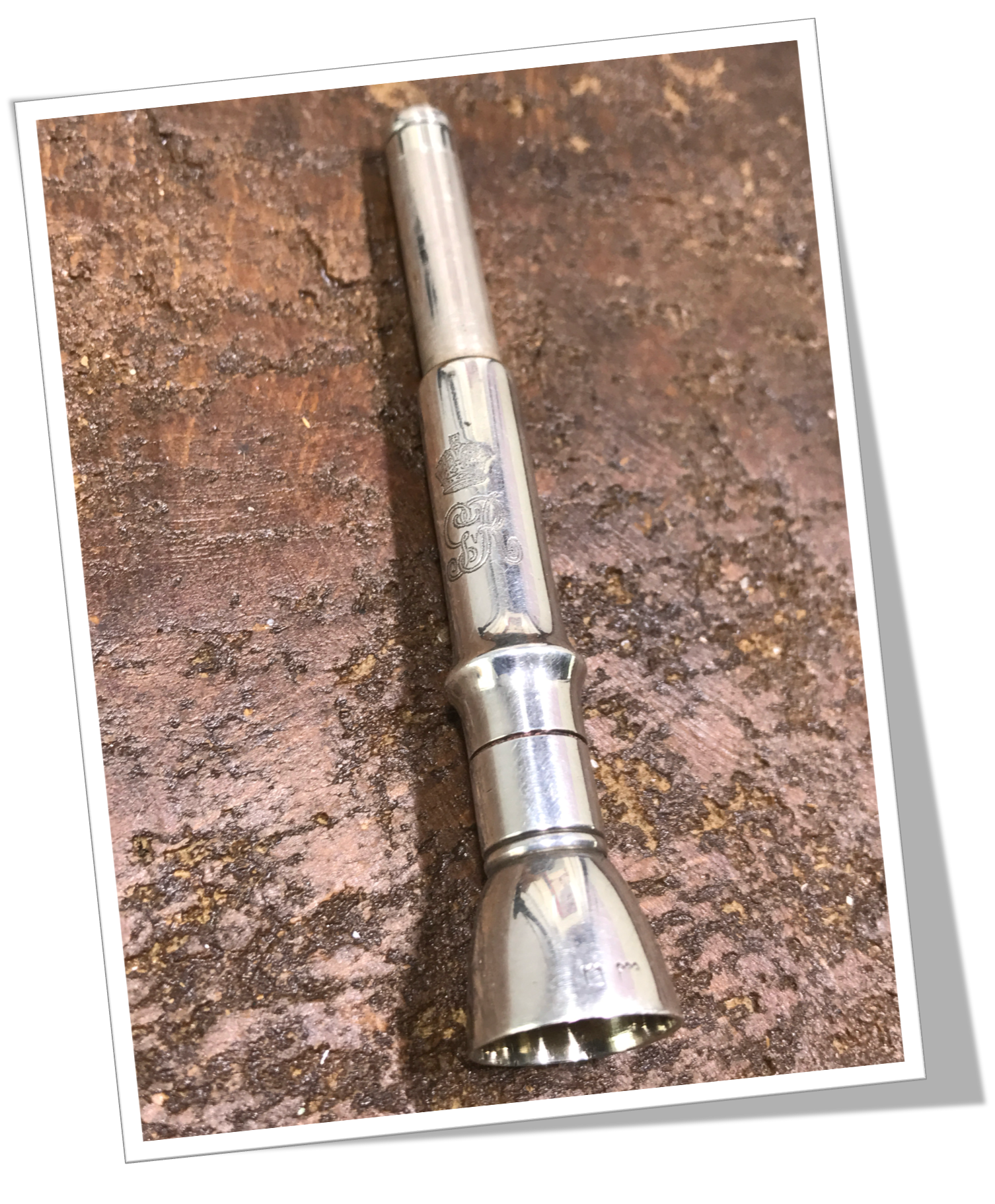 Perce-Cigare de poche En argent 925 et en forme de trompe, agrémenté du monogramme « GR ».Pique à ressort Perce-Cigare.