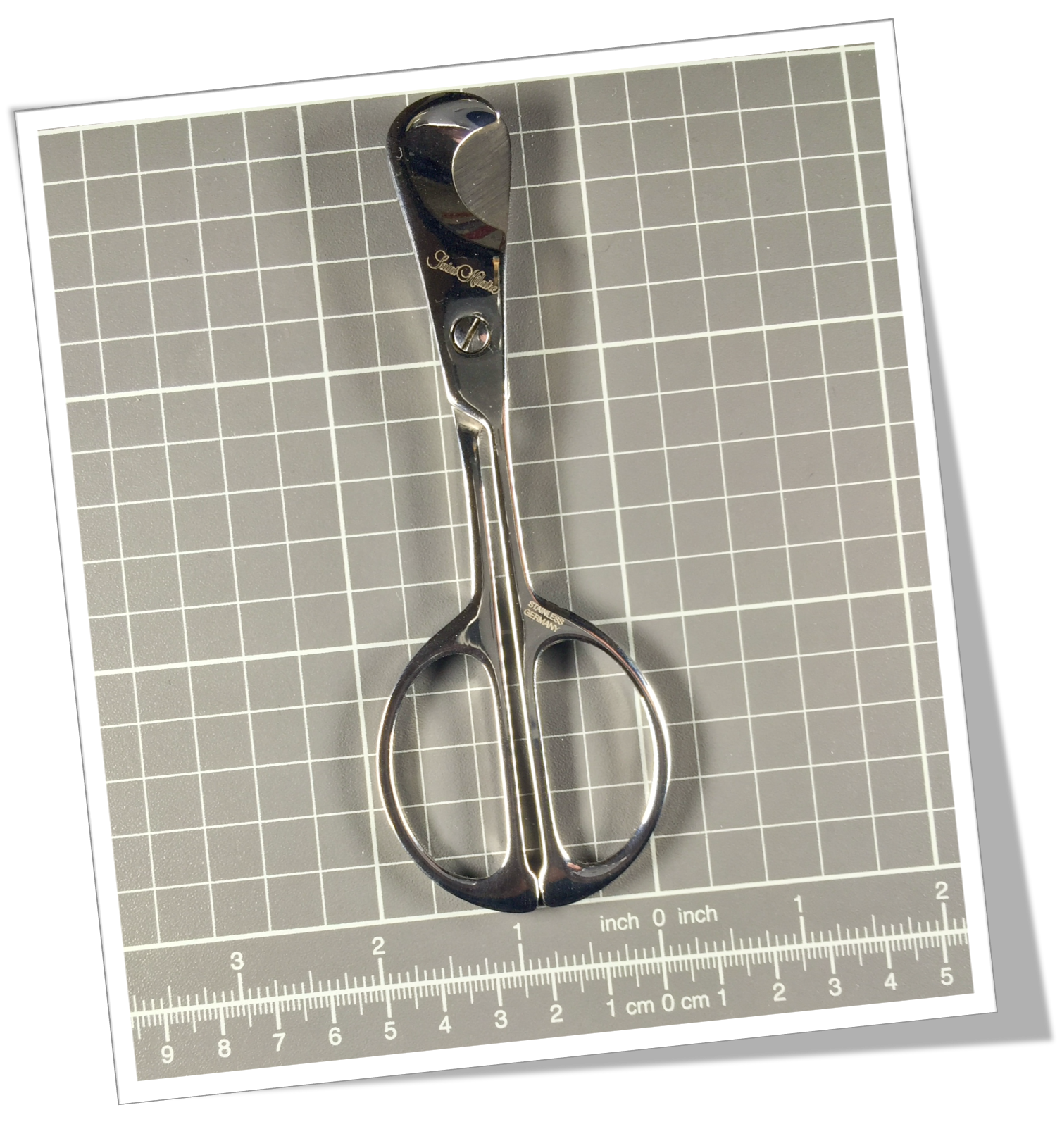 Coupe-Cigare de table En acier chromé.Ciseaux à prises en demis lunes, formant un cercle. Tronc long. Sécateur à bout en goute. 15cm.