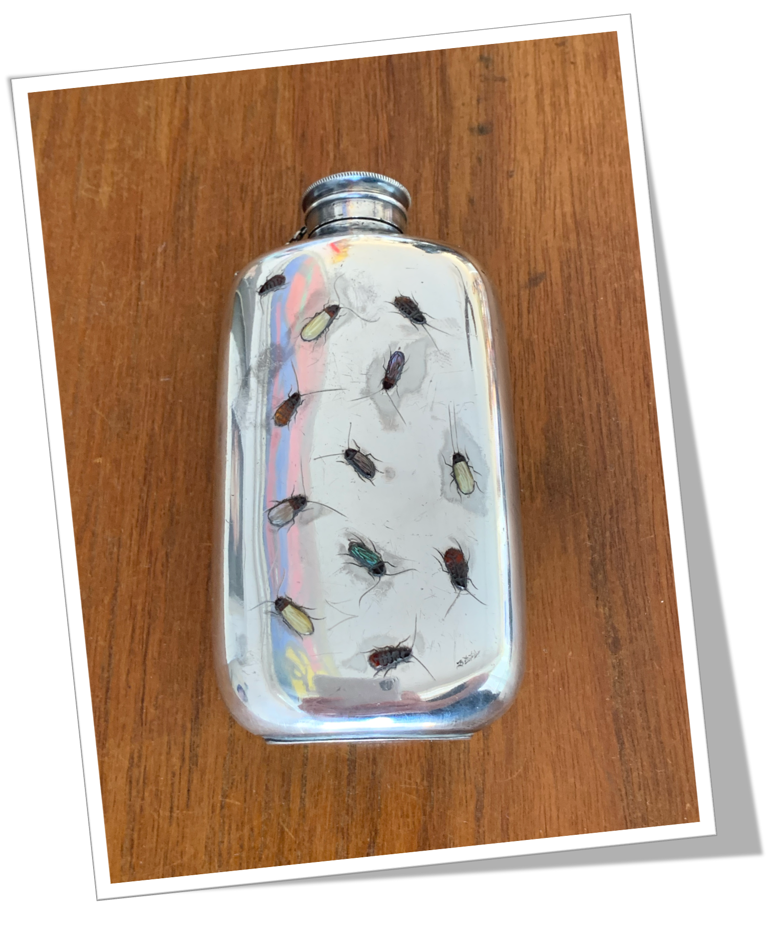 Flasque En métal argenté lisse poli miroir avec insectes Shibayama appliqués au recto.Ouverture par bouchon solidaire à pas de vis.