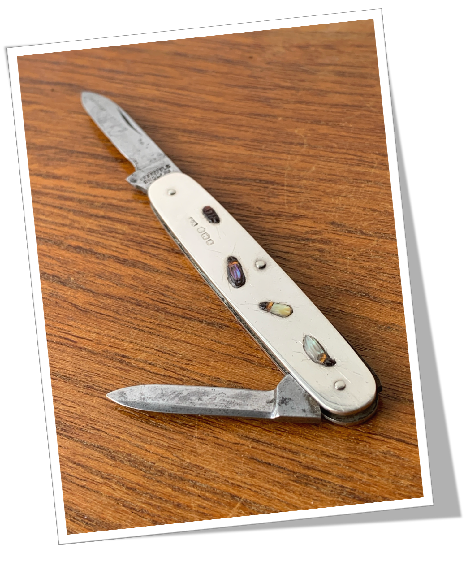 Couteau canif Manche à côtes ovoïdes en argent 925. Lisse poli miroir avec insectes de style Shibayama, appliqués au recto.2pcs: Grande lame et petite lame.