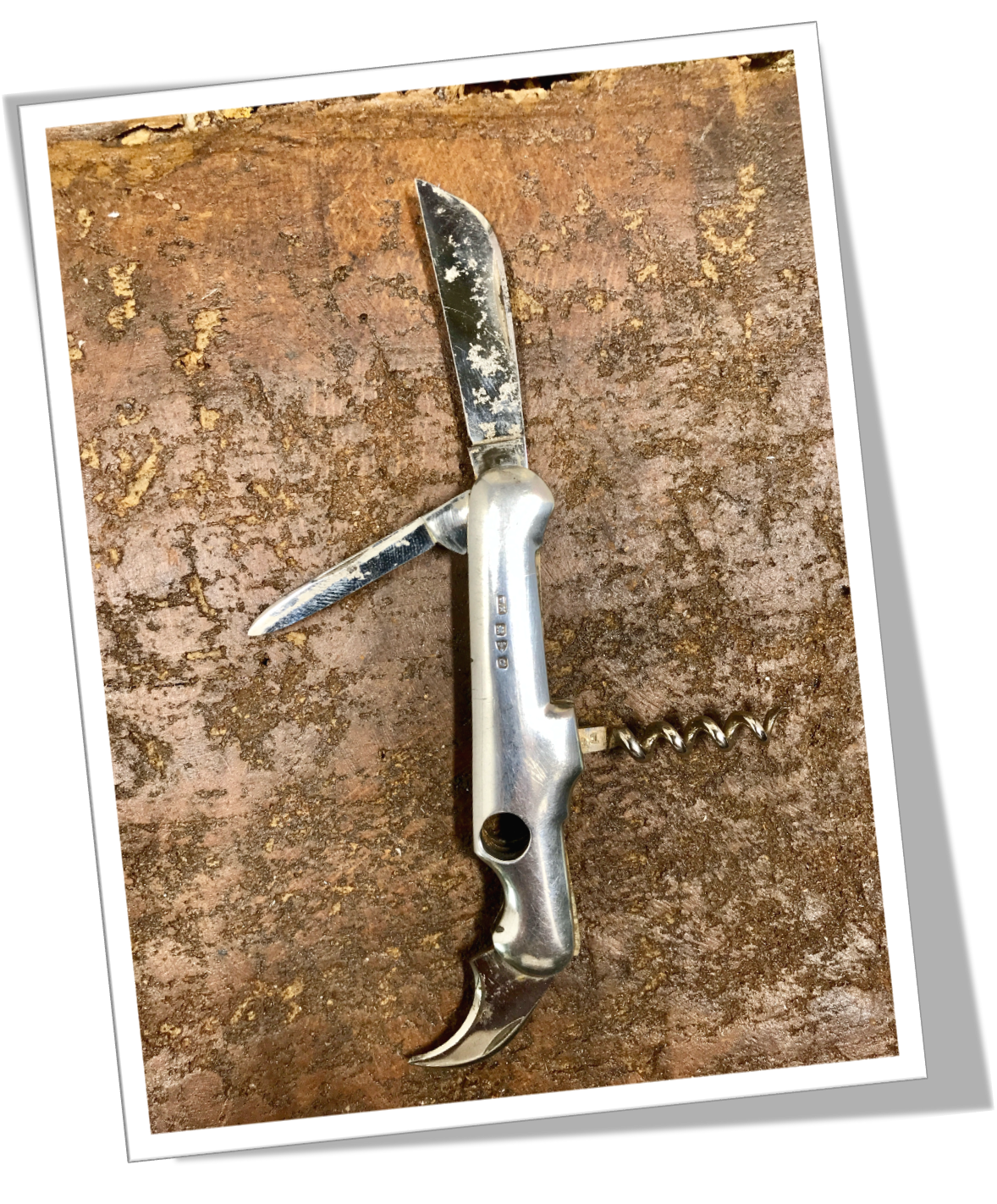Couteau canif Manche à côtes polygones stylisées en argent 925.4pcs+: Grande lame, petite lame, ouvre boîte et tir bouchon. +1pcs: Orifice à coupe-cigarillos. 14cm.