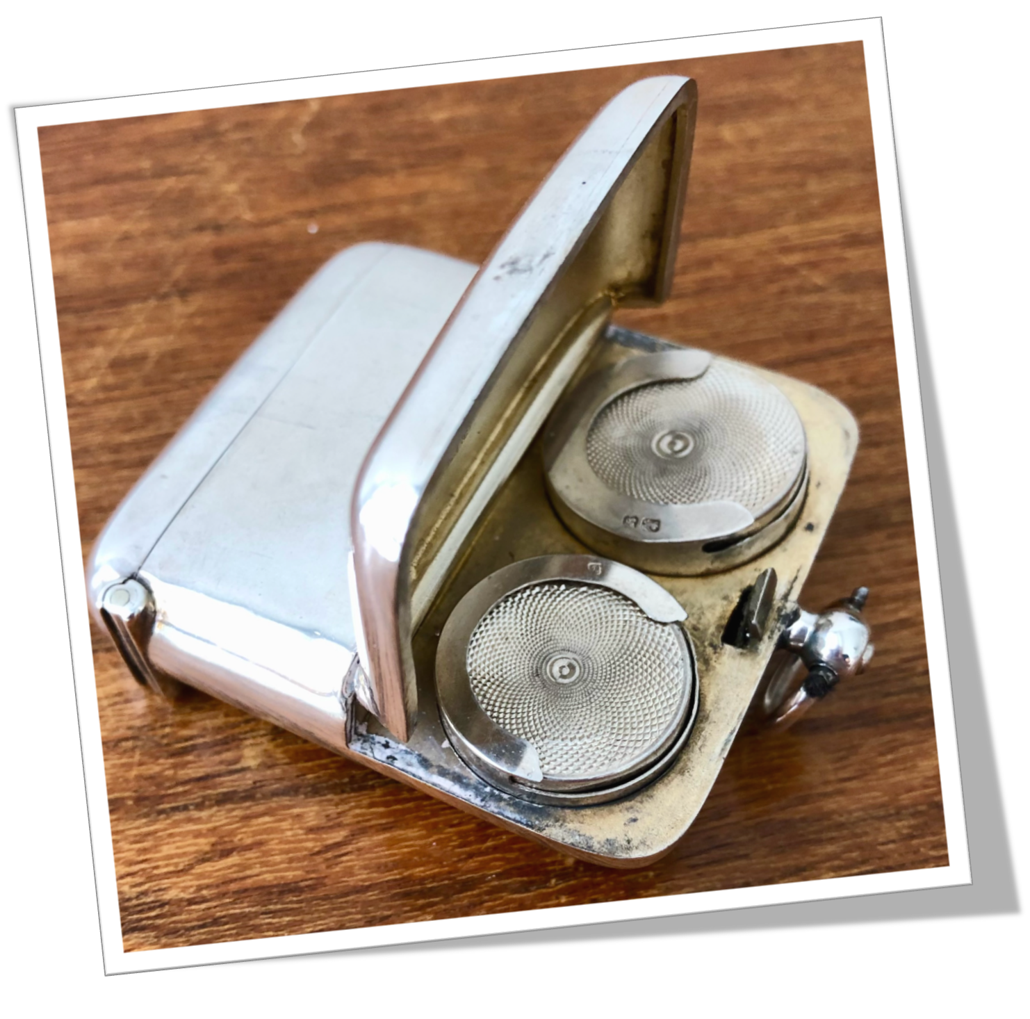 Pyrogène Vesta Case En argent 925 et de forme carré. Lisse poli miroir. Intérieur gilt « vermeil » du compartiment à allumettes. 55,8g.Combiné: Clapet 1/5 4/5 avec grattoir concave intégré. Capot 1/2 1/2 pour le second compartiment à double récepteurs de Sovereign (guilloché) avec bouton poussoir (intégré dans la bélière haute).