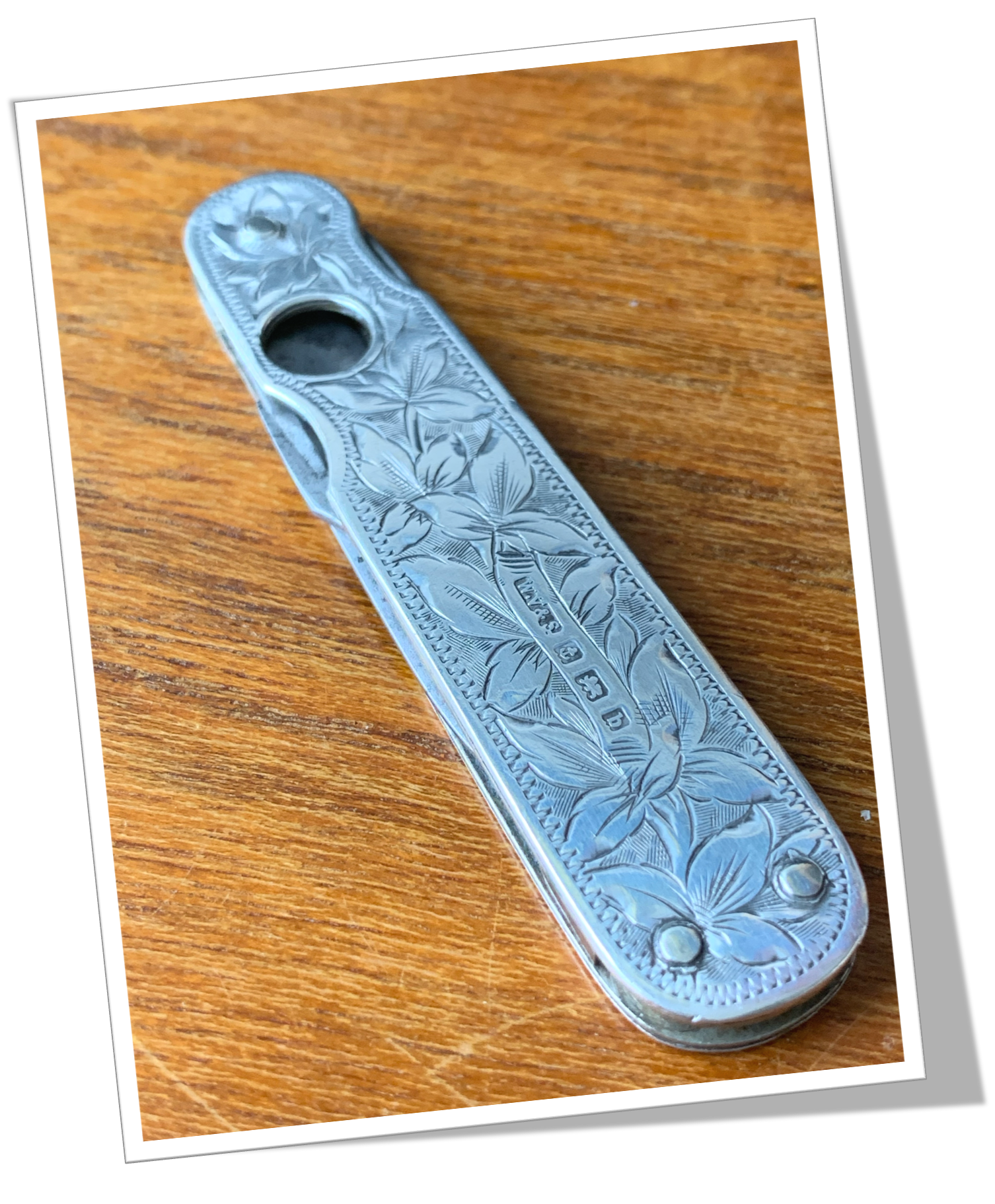 Couteau canif Manche à côtes ovoïdes en argent 925, rehaussées d’un décor floral ciselé, de style Art Nouveau.3pcs+: Grande lame, pique et fourchette +1pcs: orifice coupe cigarillos. 13cm.