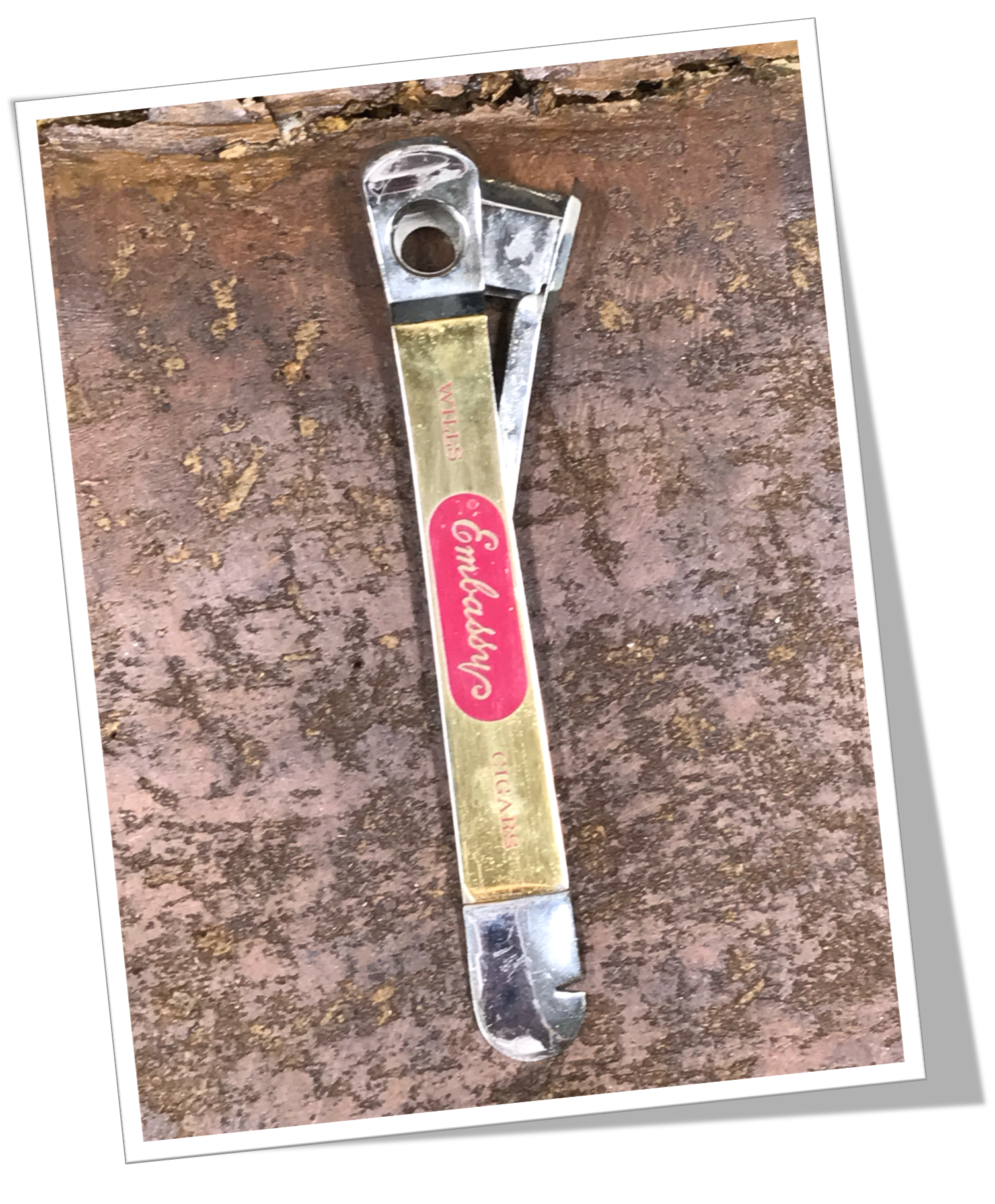 Coupe-Cigare de table Côtes appliquées en métal doré, lisse poli miroir, rehaussées d’une sérigraphie de couleur rouge à l’inscription dorée « WILLS EMBASSY CIGARS ».En acier chromé. Manche long agrémenté d’un « pied de biche » et d’une tête moderne, de type Cut-Eye (V-Cut) + Straight-Cut. 14cm.