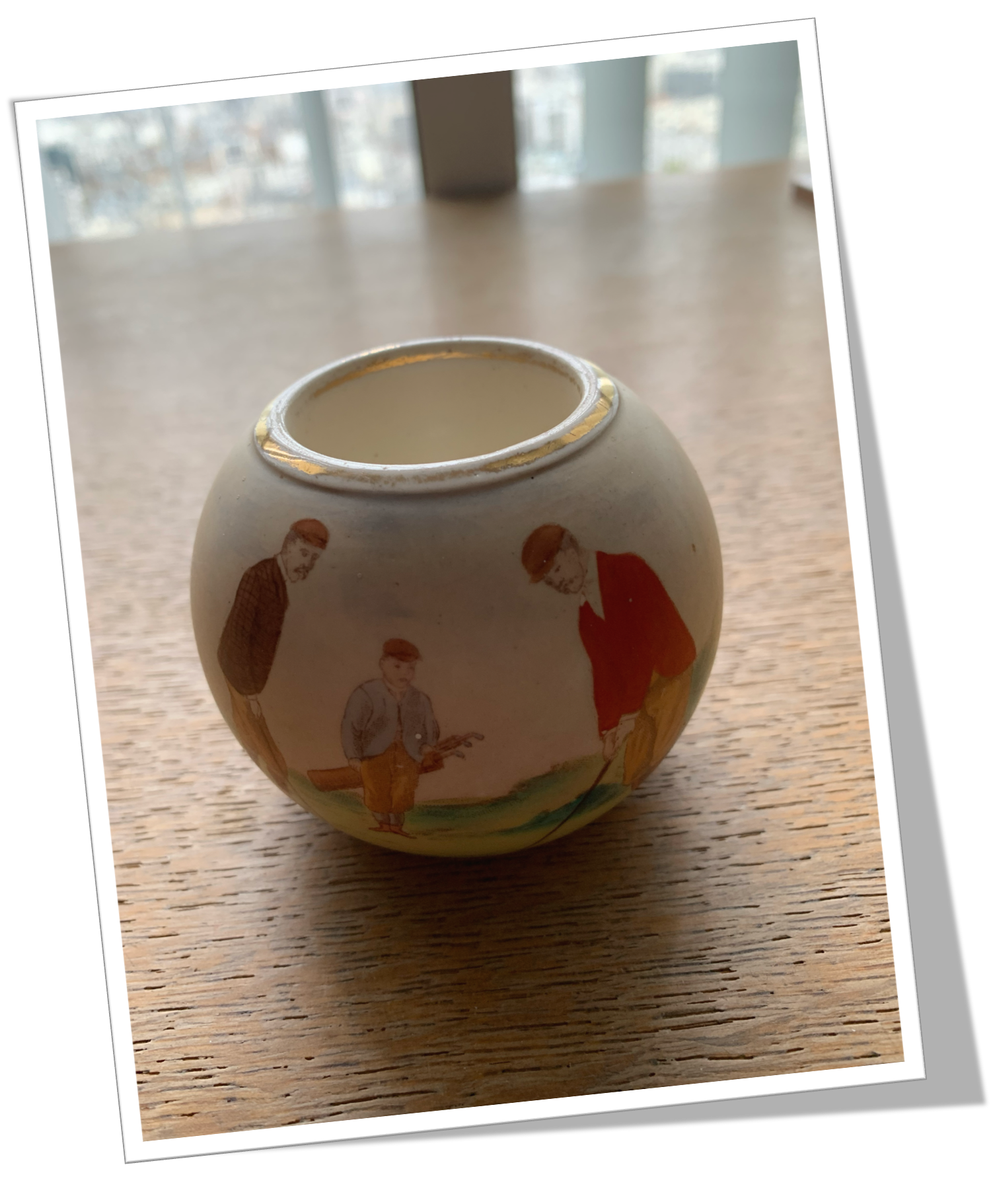 En céramique, rehaussé d’une illustration polychrome, représentant une scène de golfeurs en action. 376gr.
