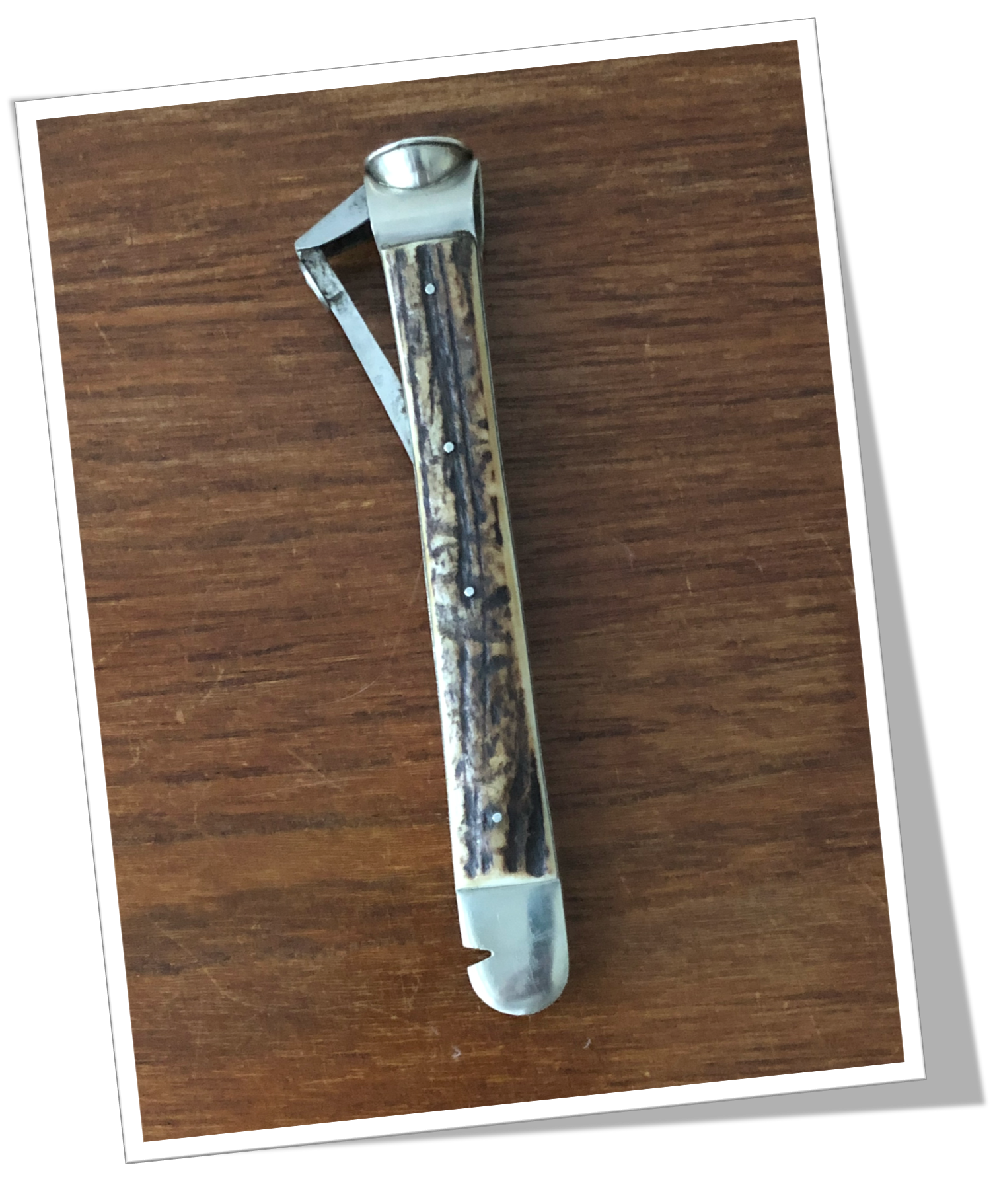 Coupe-Cigare de table Côtes rivetées en bois de cerf.En acier. Manche long agrémenté d’un « pied de biche » et d’une tête ancienne de type Cat-Eye (V-Cut), rehaussée d’un bouton circulaire à sillons. 13cm.
